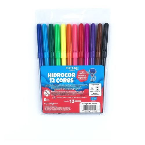 A canetinha hidrografica 12 cores Futuro Office e ideal para uso escolar e pequeno trabalhos. Contem 12 cores lindas e vibrantes. Vem acomodadas em um estojo de plastico com lacre de seguranca.