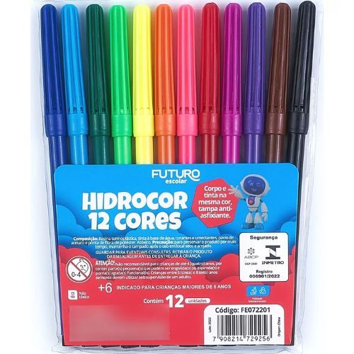 Apresentamos a Canetinha Hidrocor Lavavel 12 Cores Escolar Atoxico Colorir da Marca Futuro Escolar - a companheira perfeita para despertar a criatividade e trazer cor a vida escolar de criancas e adolescentes!