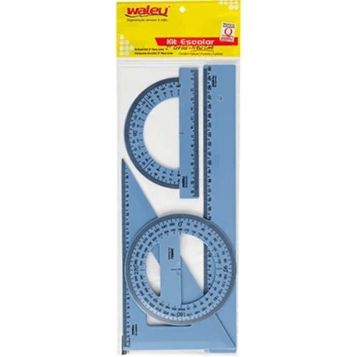 O Kit Escolar 2o Grau New Line e ideal para estudantes. Contem regua de 30 cm, esquadro de 60?, transferidores de 180? e 360?, tudo em poliestireno resistente de 3 mm, com certificacao INMETRO.